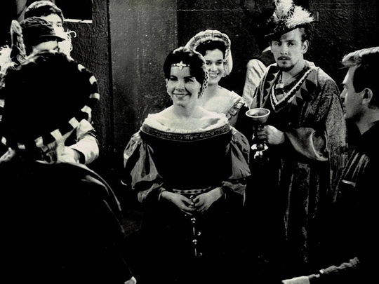 Rehearsals for early TV drama The Taming of the Shrew (1963). From centre, Patricia Turner (as Bianca), unknown, Wayne Tourell (holding cup, as Hortensio), director and narrator John Kim, and at far right (visible when you press on the photo), Jennifer Barrer (Katherina).